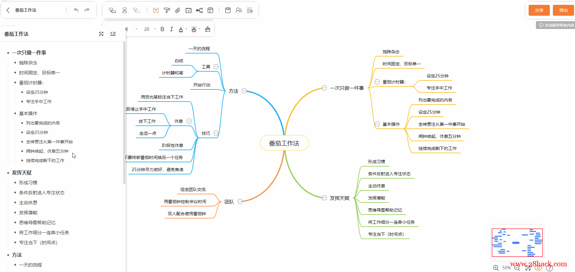 主要功能:大纲视图、一键自动布局、多人云协作、插入富文本、批量管理文件、格式刷、自定义主题、快速查看历史版本、一键分享、多格式文本导出、电脑手机云同步等等。可以用来绘制思维导图、逻辑结构图、公司组织架构图,完美适用于做读书笔记、项目规划、会议记录以及头脑风暴等。