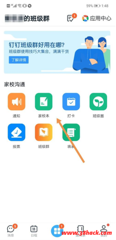 2、进入到“工作”界面,点击“家校本”。