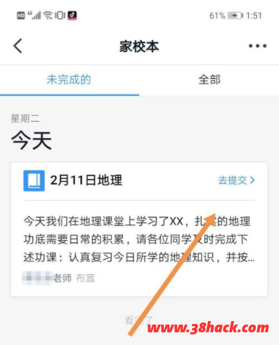 3、进入到“家校本”界面,找到你要提交的作业,点击“去提交”。