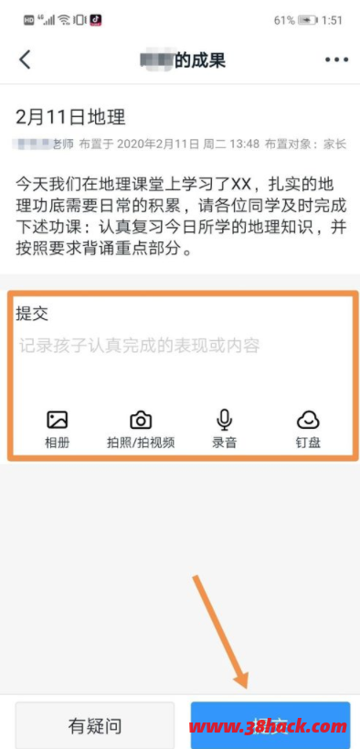 4、在“提交”一栏,我们可以通过文字、图片、语音等方式上传作业,然后点击“提交”。
