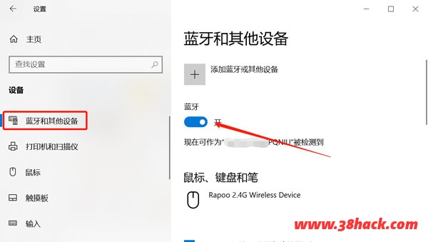 3、在左侧的菜单中选择【蓝牙和其他设备】,将右侧的开关打开,如果需要添加蓝牙设备,选择【添加蓝牙和其他设备】