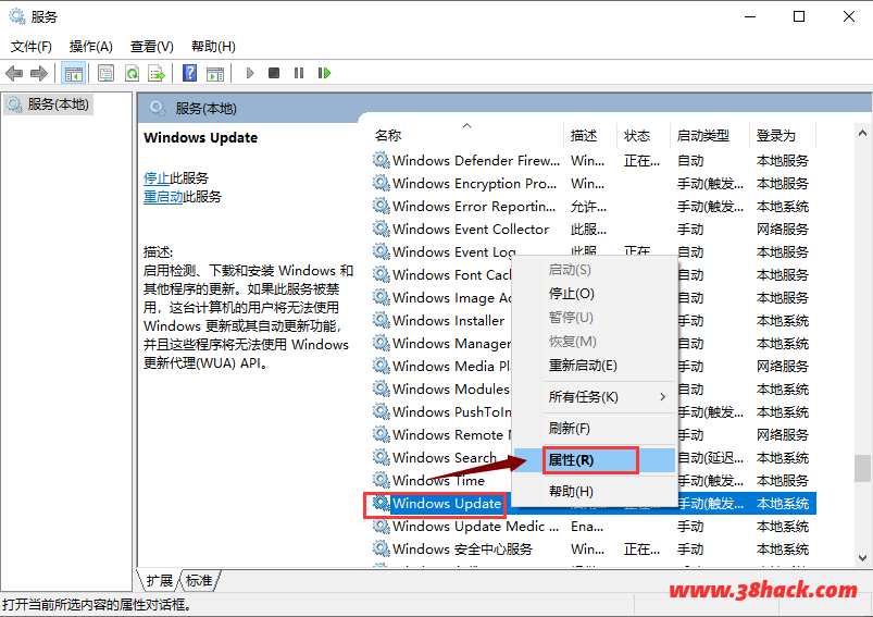 2,进入服务界面,找到“Windows update”选项,并右键点击选择“属性”。