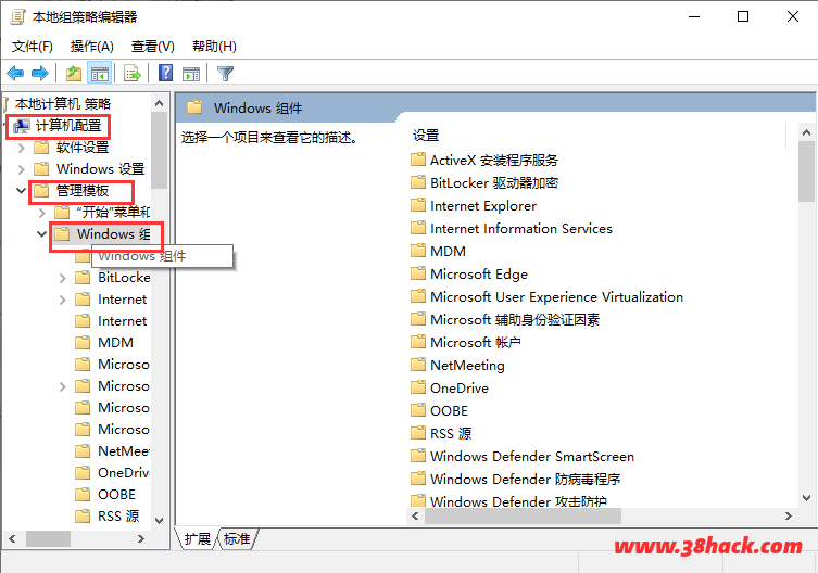 2,进入本地组策略编辑器界面,依次展开“计算机配置”——>“管理模块”——>“Windows组件”,下一步。