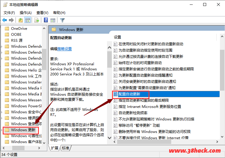 3,找到“Windows更新”并点击展开,双击右侧的“配置自动更新”选项。
