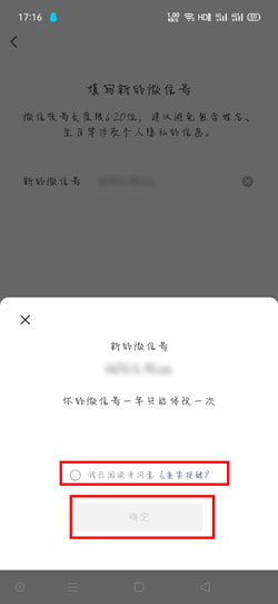 7、点击下一步后,回弹出确认窗口,点击【我已阅读并同意……】,然后点击【确定】即可完成微信号的修改。