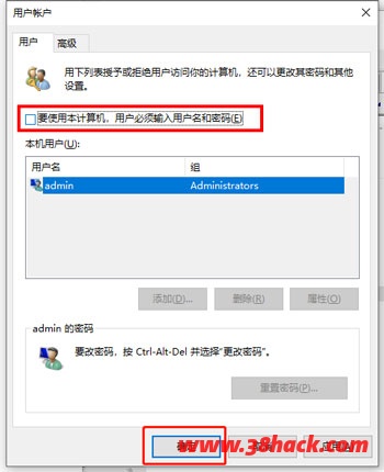 3、进入Win10用户账户窗口后,我们将【要使用本计算机,用户必须输入用户名和密码】前面的勾去掉,然后点击底部的“确定”,如下图所示。