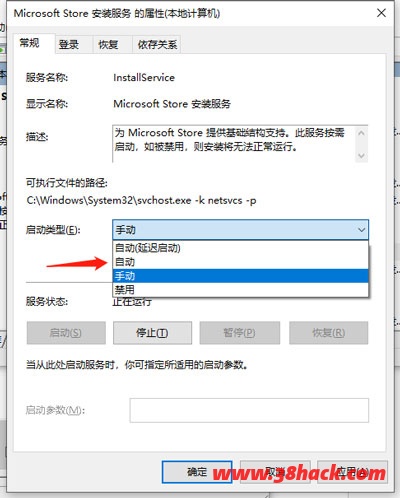 3、然后我们在Microsoft Store安装服务的属性(本地计算机)窗口将常规里面启动类型改为自动;