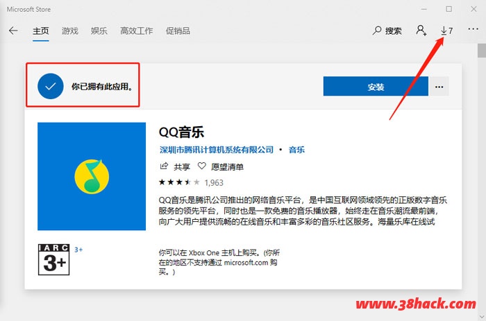 8、当页面上提示【你已拥有此应用】时(如果不提示,点击“安装”进行下载),点击右上角【下载】;