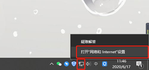 右击电脑右下角的“WiFi”、“电脑”标志,选择【打开“网络和Internet”设置】;