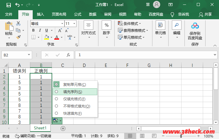 5、如果我们在下拉时,没有按住Ctrl键,那么被选中的单元格数据会全部被替换成第一个单元格的数据,可以点击右下角出现的【自动填充】按钮,选择【填充序列】;