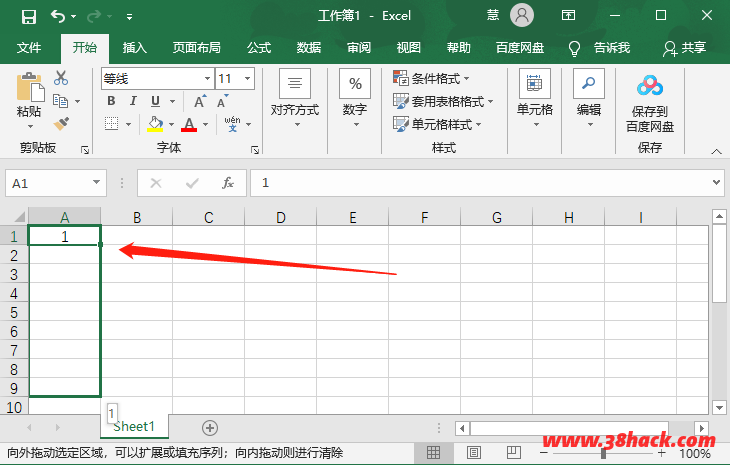 2、然后按住Ctrl键,拉动数字1所在单元格右下角的【填充键】,选中其他空白单元格;