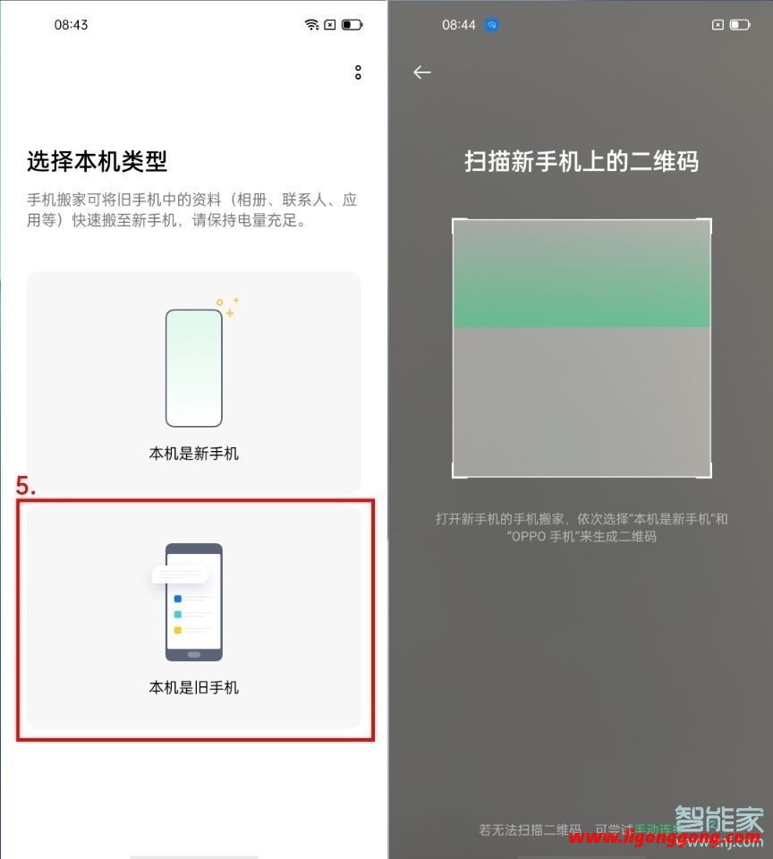 4、在旧手机上点击本机是旧手机,就会出现扫码界面,用旧手机扫描新手机上的二维码。