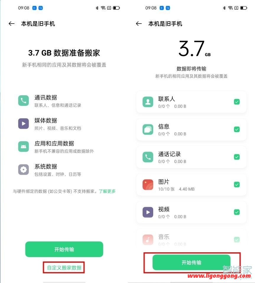 5、系统默认传输所有数据,点击下方自定义搬家数据,也可以根据自己的需要勾选是否传输。