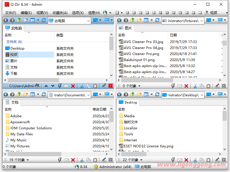 Q-Dir 是一款强大且走极端路线的文件管理器,能快速方便地访问您的硬盘,网络文件夹,U盘,软盘和其他存储设备。Q-Dir不需要安装,可以从桌面轻松执行,并且可以携带在一个小的U盘或其他存储设备上。 Q-Dir中的文件管理基于MS Windows资源管理器,但4x加上标签和更多的功能! 小编怀疑软件作者患有文件整理强迫症,一般软件作者不会想到设计一款具有四个文件夹整理窗口的文件管理器,再加上额外的文件夹树窗口,就是五个窗口了。Q-Dir便携版由NoCmd发布!Q-Dir 特别适合用户频繁在各个文件夹中跳转进行复制粘贴的文件归档操作,如果你的电脑硬盘中文件已经凌乱无章难以归类的话,建议你使用该软件进行高效率的整理。