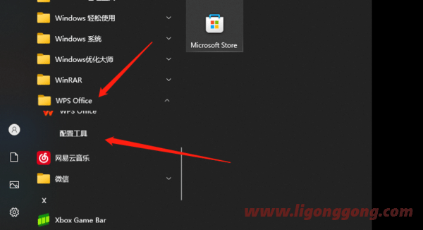 大家首先点击桌面的【开始】,在如图位置找到【WPS office】的文件夹,点击后找到【配置工具】;