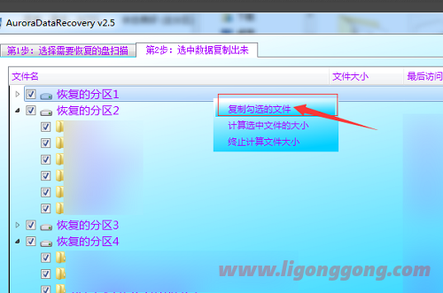 5、勾选需要恢复的数据,右击“复制勾选的文件”。