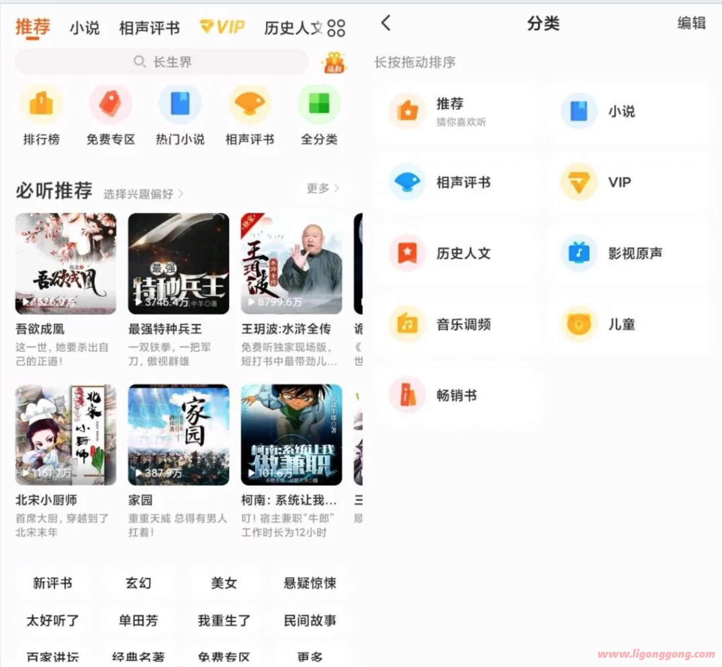 国内最全有声资源,50000部有声小说,30000段相声小品,1800档电台栏目,百万正版音乐,数十万部儿歌儿童读物、笑话段子、名家评书、英语学习、培训资料、健康养生、文学名着等,最精细完美的分类,最优质专业的内容呈现,最懒人的听书方式,爱听什么就听什么。