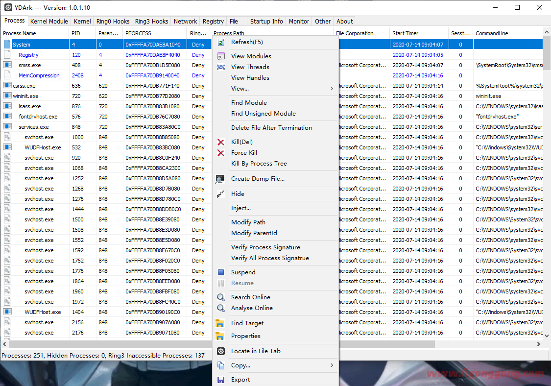 YDArk是一款免费适用于64位的Windows系统内核辅助工具,ARK反内核工具。具有系统动作监控、系统内核查看、应用层钩子、内核钩子扫描、文件管理、进程管理、启动项管理、注册表管理、服务管理、驱动模块、网络管理、系统杂项修复等功能。用它可以查看各类系统信息,通过监控分析管理系统各种行为。