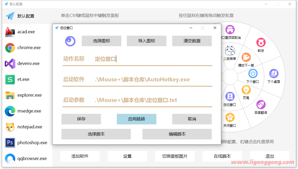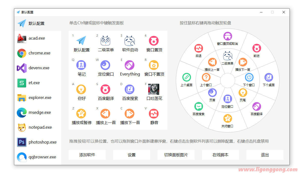1、按住右键再拖动触发操作轮盘,期间按住Shifit绑定当前窗口,点击托盘mouse+.exe代表全局窗口。