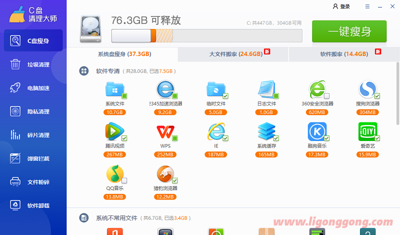 可以帮助用户对系统盘进行一键瘦身,清理系统盘虚拟内存,补丁备份,软件垃圾等