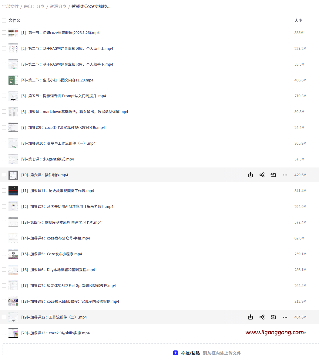 基础入门(初识Coze与智能体)、核心技能(基于RAG构建企业知识库/个人助手/生成小红书图文内容/提示词工程Prompt从入门到提升)、技术进阶(Markdown语法/变量与工作流组件/多Agents模式/插件制作/数据库基本原理)、加餐实战(历史故事视频类工作流/从零创建AI应用/Coze发布公众号与小程序/Dify本地部署/FastGpt部署/Coze接入liblib室内装修/Coze2.0与Skills实操)。